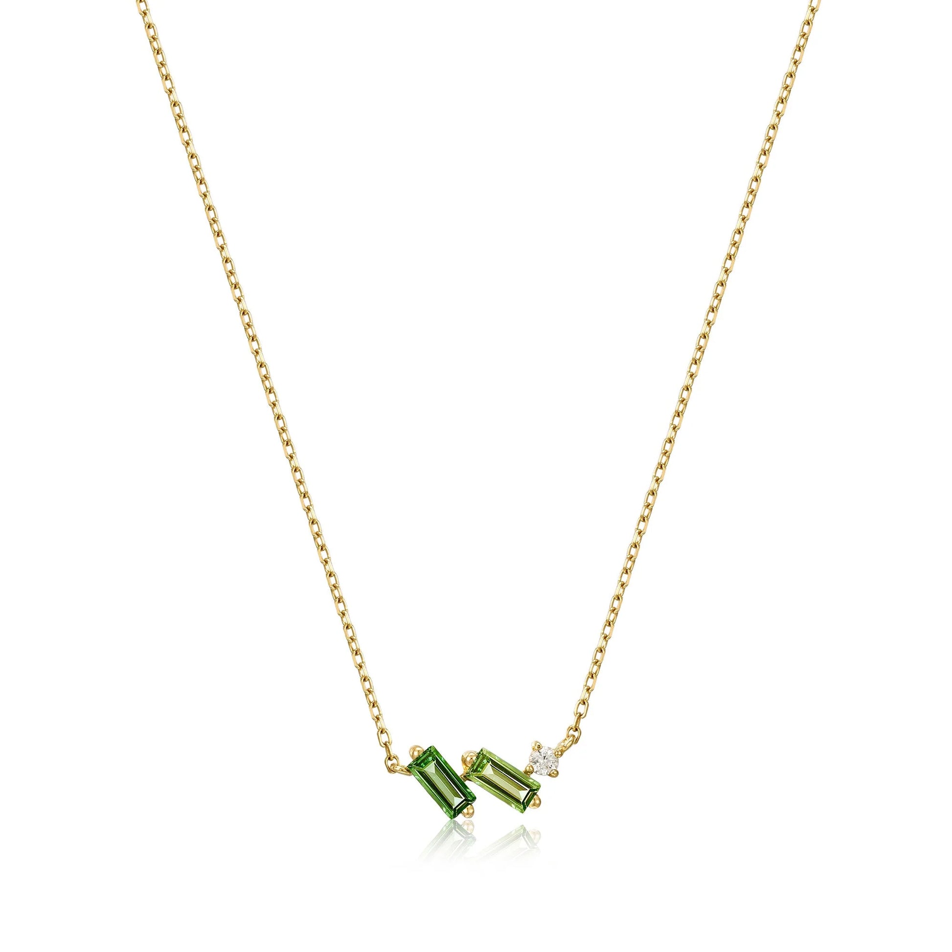 Timeless, elegant and yet unexpectedly unique, this striking necklace adds something truly special to your collection this season. The perfect pairing of two stunning green tourmaline stones in differing hues and a sparkling white sapphire stone, the asymmetric detailing is set on a delicate recycled solid gold chain. Wear it simply or layer with dainty gold chains.