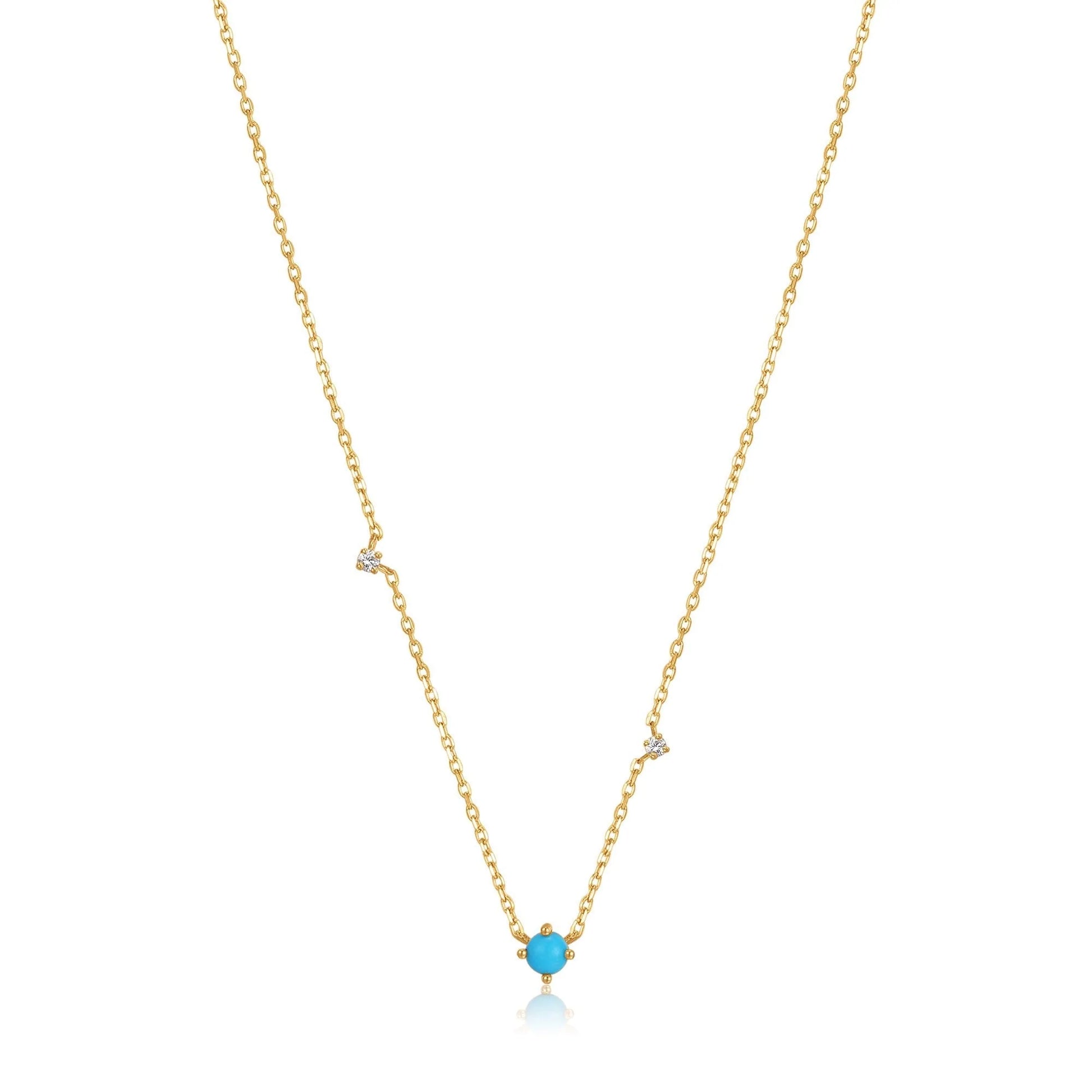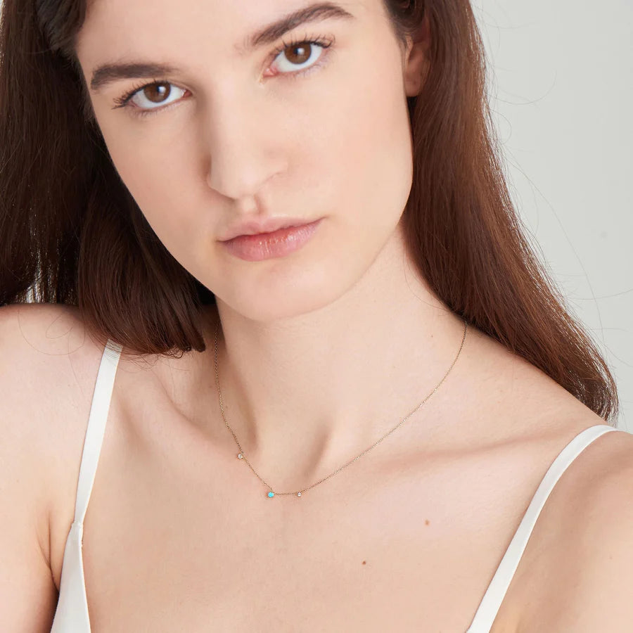 A unique take on a simple everyday chain necklace, play with both sparkle and colour with this striking asymmetric design. On a delicate 14kt gold chain, a vibrant turquoise stone takes centre stage in this vivid piece. Flanked with asymmetrically placed white sapphire stones, it’s the perfect balance of day-to-day simplicity with a high-end twist.