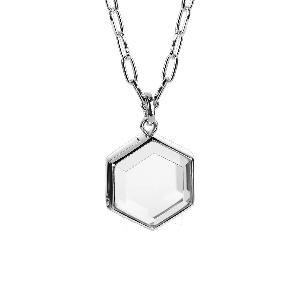 This beautiful hexagonal locket is finely crafted from solid sterling silver and features the highest quality sapphire crystal glass front with faceted edges. This medium sized locket can hold 10-12 beautiful charms to create a personalised jewellery keepsake.